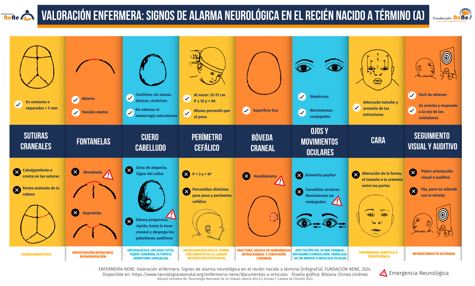 Con esta infografía Enfermería NeNe pone el foco en la importancia que tiene la observación /identificación precoz de los signos de alarma neurológicos en el recién nacido por parte de enfermería, para facilitar una actuación rápida y eficaz del equipo sanitario.